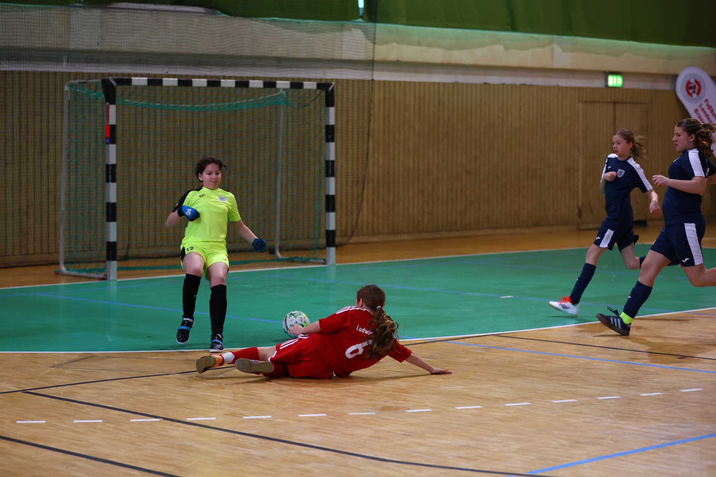 Die D1 startete gegen Babelsberg 03 in den Tag und übernahm durch ein 2:0 und zwei wunderschön herausgespielte Tore von Zoey sogleich die Tabellenführung in der Gruppe Rot. Im nächsten Gruppenspiel gegen die SG Schwanebeck taten sich die Mädels lange schwer. Zu viele Ungenauigkeiten gegen einen kompakten Gegner und nicht die letzte Konsequenz im Abschluss zwangen unsere Greta zu einem Gewaltschuss aus 17 Metern, der letztlich die Torhüterin überwand. Auch das ist Fußball – manchmal hilft nur die Brechstange. Im letzten Gruppenspiel ging es für uns gegen den Dauerrivalen aus Wandlitz. Am Ende stand ein 1:0 für die Eintracht. Unsere Mädels kamen von Anfang an nicht ins Spiel und suchten ihre Form. Das sonst so präzise Kurzpassspiel, das unsere Mädchen in der Liga regelmäßig auszeichnet, fehlte in diesem Spiel komplett. So reichte den Gegnerinnen ein freches Tor aus spitzem Winkel für den Sieg und damit den Gruppensieg. Damit stand unser Halbfinale fest, es ging gegen Turbine. Mit der Niederlage gegen Wandlitz in den Köpfen ging es aufs Parkett. Eine lange ausgeglichene Partie tröpfelte dahin, mit Chancen auf beiden Seiten. Als sich alle schon auf ein 6-Meter-Schießen einstellten, setzte Turbine einen sauberen Konter, den unsere Mädels am Ende nicht konsequent verteidigten, und ging damit kurz vor Schluss mit 1:0 in Führung. Alles Anlaufen in der letzten Minute brachte nichts mehr ein und so war der Traum vom Finale geplatzt. Freud und Leid liegen manchmal so nah beieinander. Mit hängenden Köpfen ging es in die Kabine. Die Mädchen hatten sich mehr vorgenommen und waren sichtbar enttäuscht. Das Minimalziel sollte nun die Bronzemedaille sein. Im Spiel um Platz 3 hieß der Gegner: Babelsberg 74. Die Mädels nahmen die Aufgabe von Beginn an mit Ernsthaftigkeit und Konsequenz an, und so netzte unsere Leni zum 1:0 ein und bereitete das 2:0 durch Sophie mit einem schönen Sololauf vor. Am Ende holten die Mädels den 3. Platz und zeigten stellenweise guten Fußball, zeigten sich aber vor allem wieder als untrennbare Einheit. Auf der Bank unsere Hannah, die sich im Trainingslager verletzte und zurzeit pausieren muss, aber keinen Millimeter von der Seite ihrer Mannschaft wich. Eine Nora und eine Greta, die beide ihren Winterurlaub verkürzt haben, um ihr Team unterstützen zu können. Eine Emilia und eine Isa, die wenig Spielzeit bekommen haben, aber wenn sie gebraucht wurden, sofort „on fire“ waren und die Reservistenrolle ohne Murren hingenommen haben.