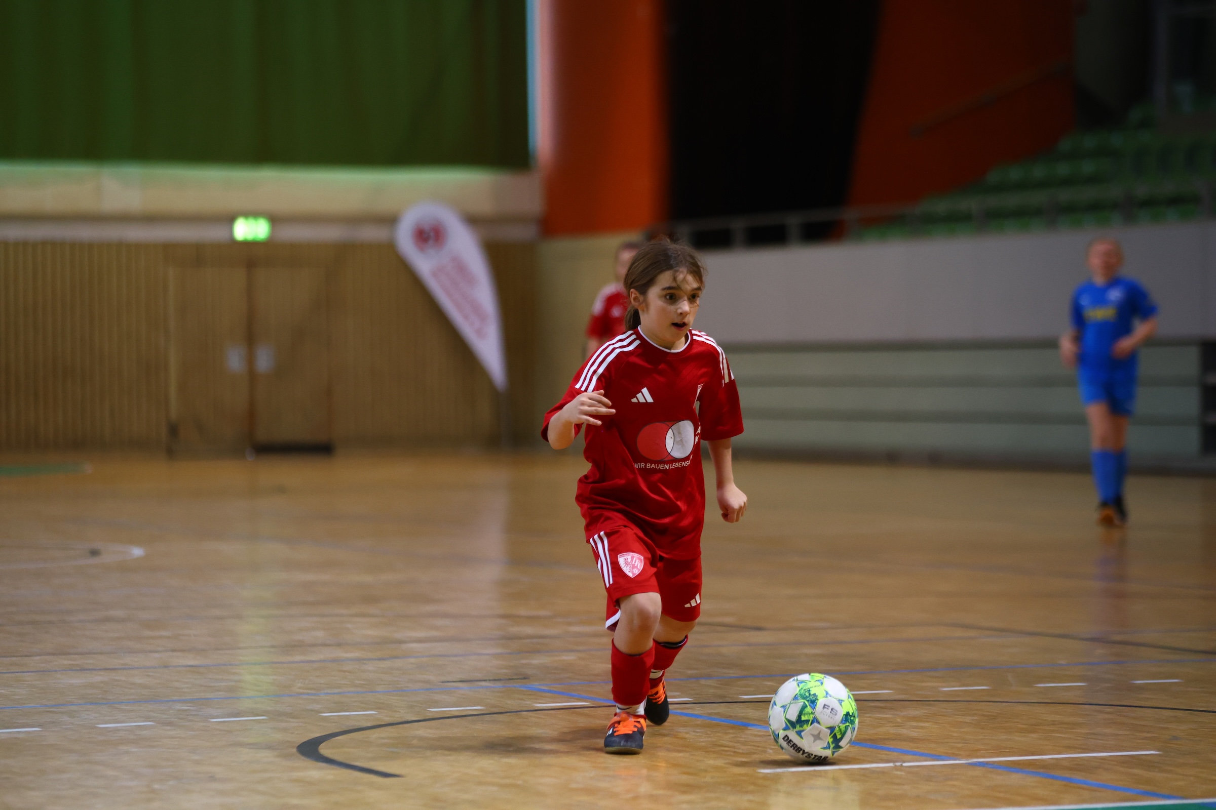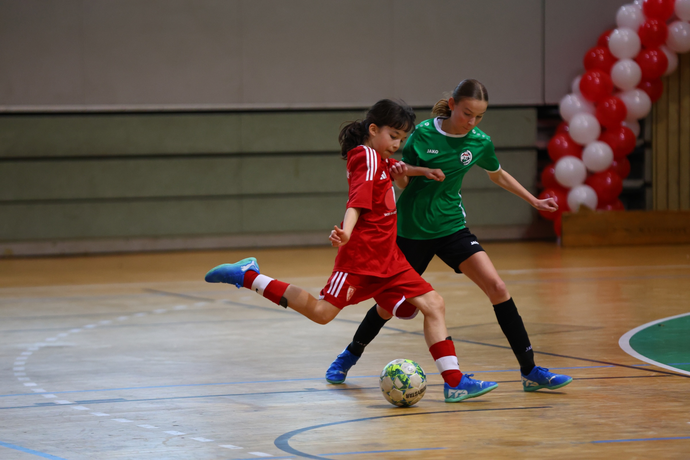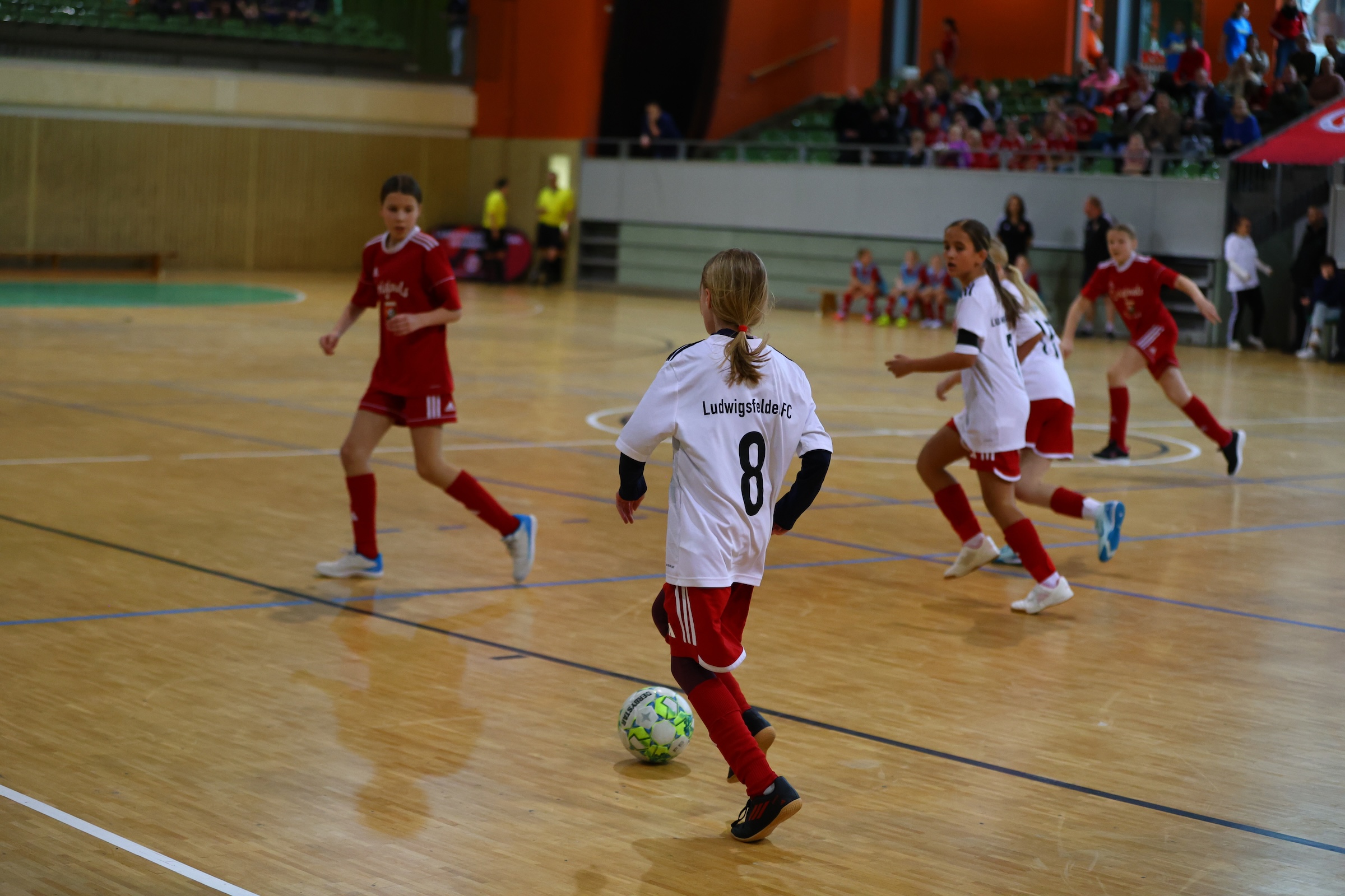 So gleich die Vereinsfarben unserer beiden Teams waren, so unterschiedlich war der Anspruch an die Mädels. Während unsere D1 aufgrund der starken Hinrunde und der aktuellen Tabellensituation zum Favoritenkreis gehörte, ging es für die Mädchen unserer zweiten Vertretung vor allem darum, Spielpraxis zu sammeln und diese einmalige Bühne zu genießen.