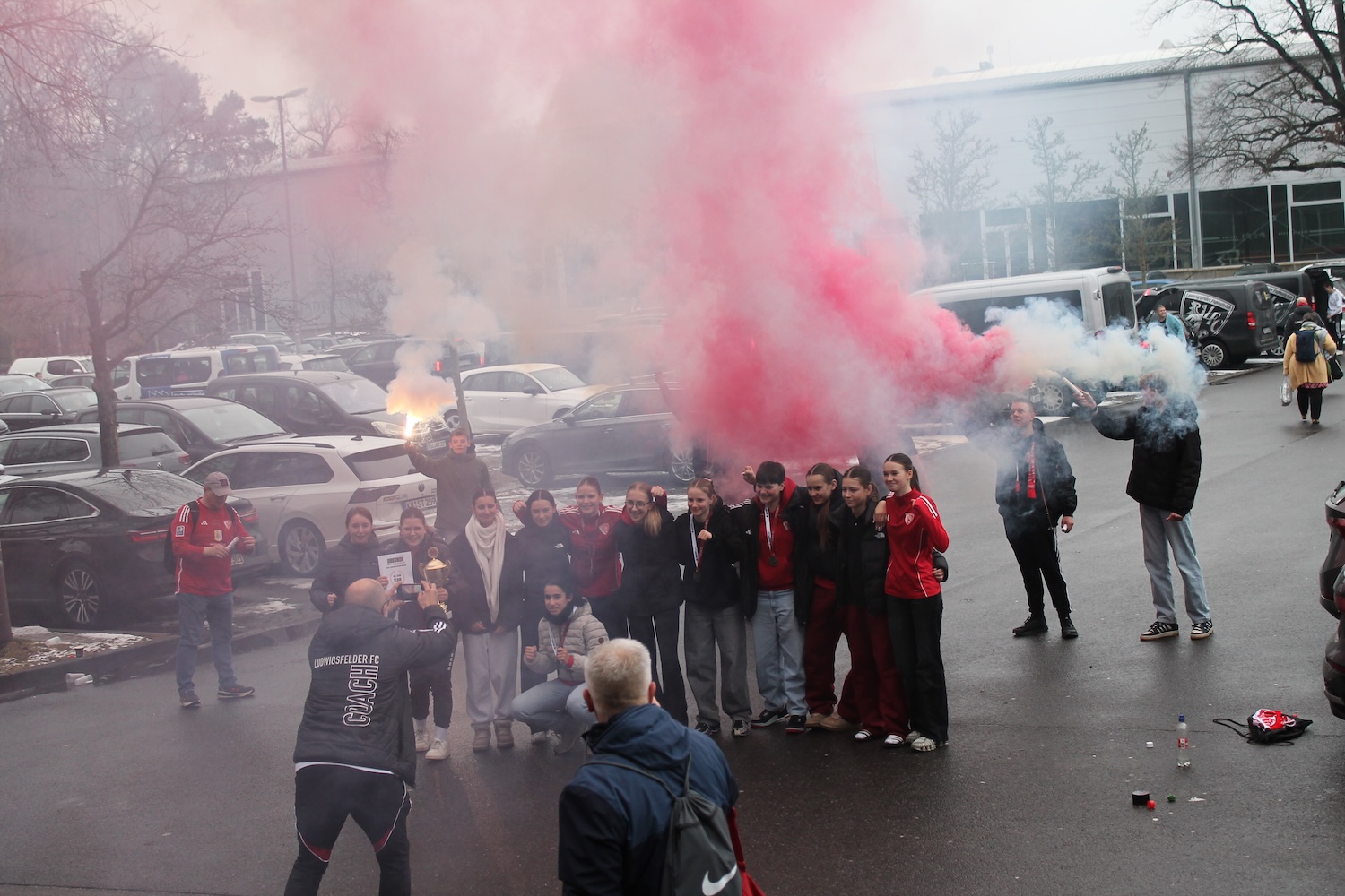Doch genau hier zeigte sich, was dieses Team ausmacht. Obwohl sie bereits die meiste Spielzeit in den Beinen hatten und sichtbar am Limit waren, meldeten sich Carlotta, Kimi und Nisa sofort. Keine Diskussion, kein Zögern. Carlotta ging als heutige Kapitänin voran, übernahm den ersten Schuss und verwandelte eiskalt. Auch alle weiteren Schützinnen trafen. Dann musste Carlotta ein zweites Mal ran – und blieb erneut nervenstark. Auf der anderen Seite scheiterte die erste Potsdamer Schützin. Dann nur noch Jubel. Erleichterung. Ungläubiges Durchatmen.